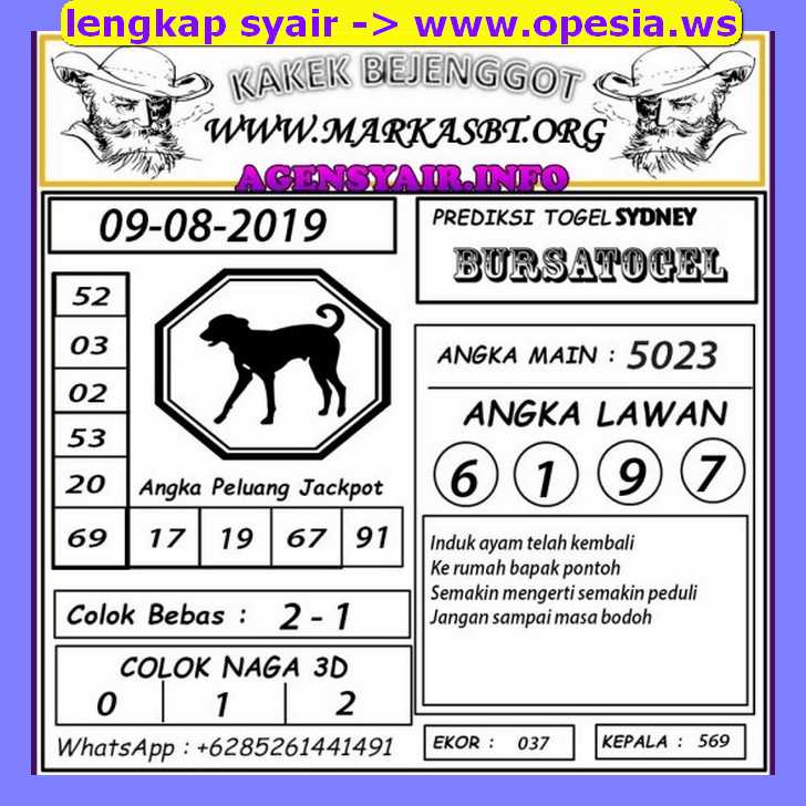Prediksi Togel Sidney, Hallo sobat togelers semuanya! disini anda akan mendapatkan prediksi angka-angka jitu yang bisa anda jadikan angka ajaib untuk bahan pertimbangan dalam pemasangan togel. Seperti yang kita ketahui bahwa tidak semua orang memiliki keberuntungan dalam pemasangan togel. Oleh karena itu tersedianya halaman prediksi togel Sidney untuk membantu anda dalam pemasangan togel. Namun ada satu hal yang harus anda ketahui yaitu angka prediksi togel tidak selalu menjamin anda terus memenangkan togel. Tidak semua hasil bocoran togel itu akurat atau jitu, kadang juga meleset. Anda juga bisa mendapatkan angka jitu melalui jalur mimpi anda dan kejadian dalam mimpi bisa di tafsirkan oleh buku mimpi yang sudah tersedia situs ini. Semoga angka prediksi memberikan anda hoki yang besar.