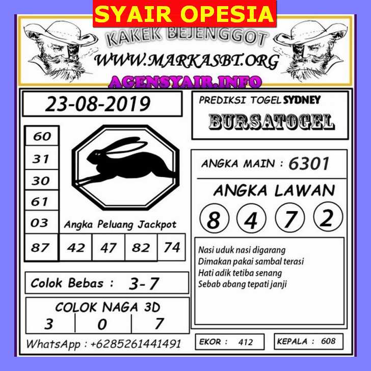 Prediksi Togel Sidney, Hallo sobat togelers semuanya! disini anda akan mendapatkan prediksi angka-angka jitu yang bisa anda jadikan angka ajaib untuk bahan pertimbangan dalam pemasangan togel. Seperti yang kita ketahui bahwa tidak semua orang memiliki keberuntungan dalam pemasangan togel. Oleh karena itu tersedianya halaman prediksi togel Sidney untuk membantu anda dalam pemasangan togel. Namun ada satu hal yang harus anda ketahui yaitu angka prediksi togel tidak selalu menjamin anda terus memenangkan togel. Tidak semua hasil bocoran togel itu akurat atau jitu, kadang juga meleset. Anda juga bisa mendapatkan angka jitu melalui jalur mimpi anda dan kejadian dalam mimpi bisa di tafsirkan oleh buku mimpi yang sudah tersedia situs ini. Semoga angka prediksi memberikan anda hoki yang besar.